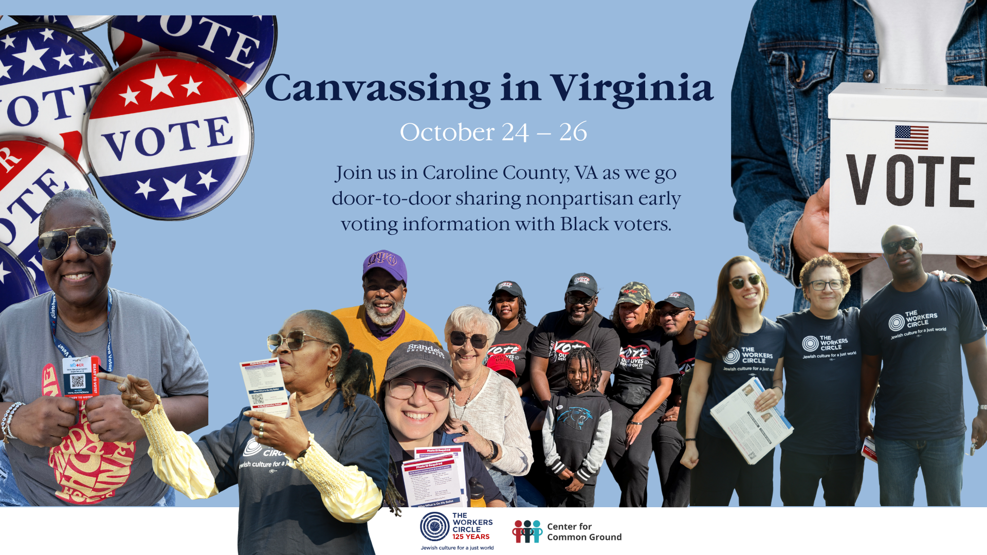 Canvassing in Virginia Friday, October 24, 2025 9:00 AM Sunday, October 26, 2025 6:00 PM Caroline County Virginia (map) Google Calendar ICS Join the Workers Circle and the Center for Common Ground in Caroline County, Virginia as we to go door-to-door and talk with Black voters to ensure they have the critical, non-partisan, early voting information they need. Register