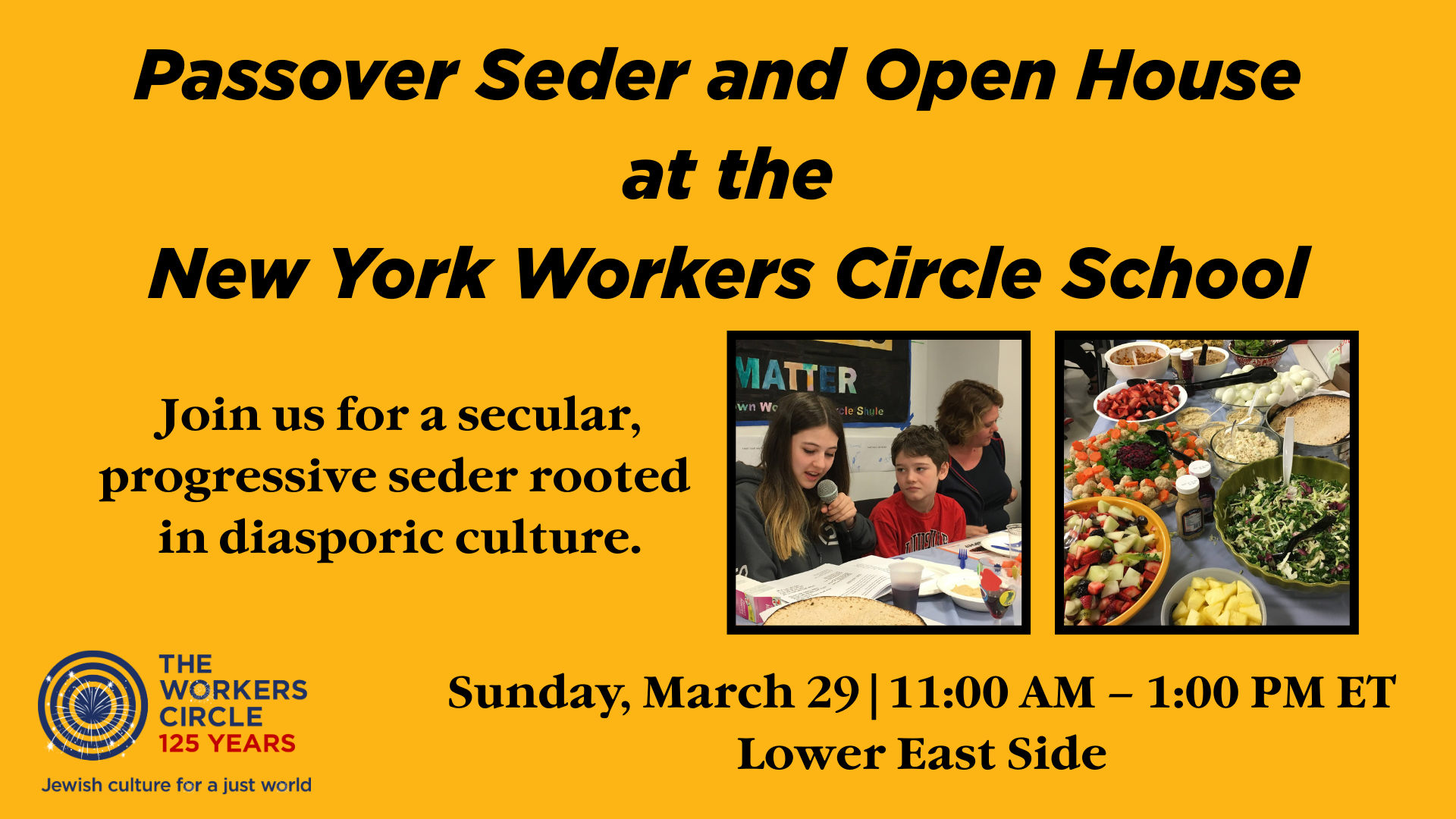 Please join us for a secular seder that is interactive and joyful but also pauses for reflection. We will be both silly and serious, improvising skits on the ten plagues, hiding afikomen, and singing in Yiddish, while also considering what it means to see the liberation of the Jewish people as interconnected to the liberation of all peoples.