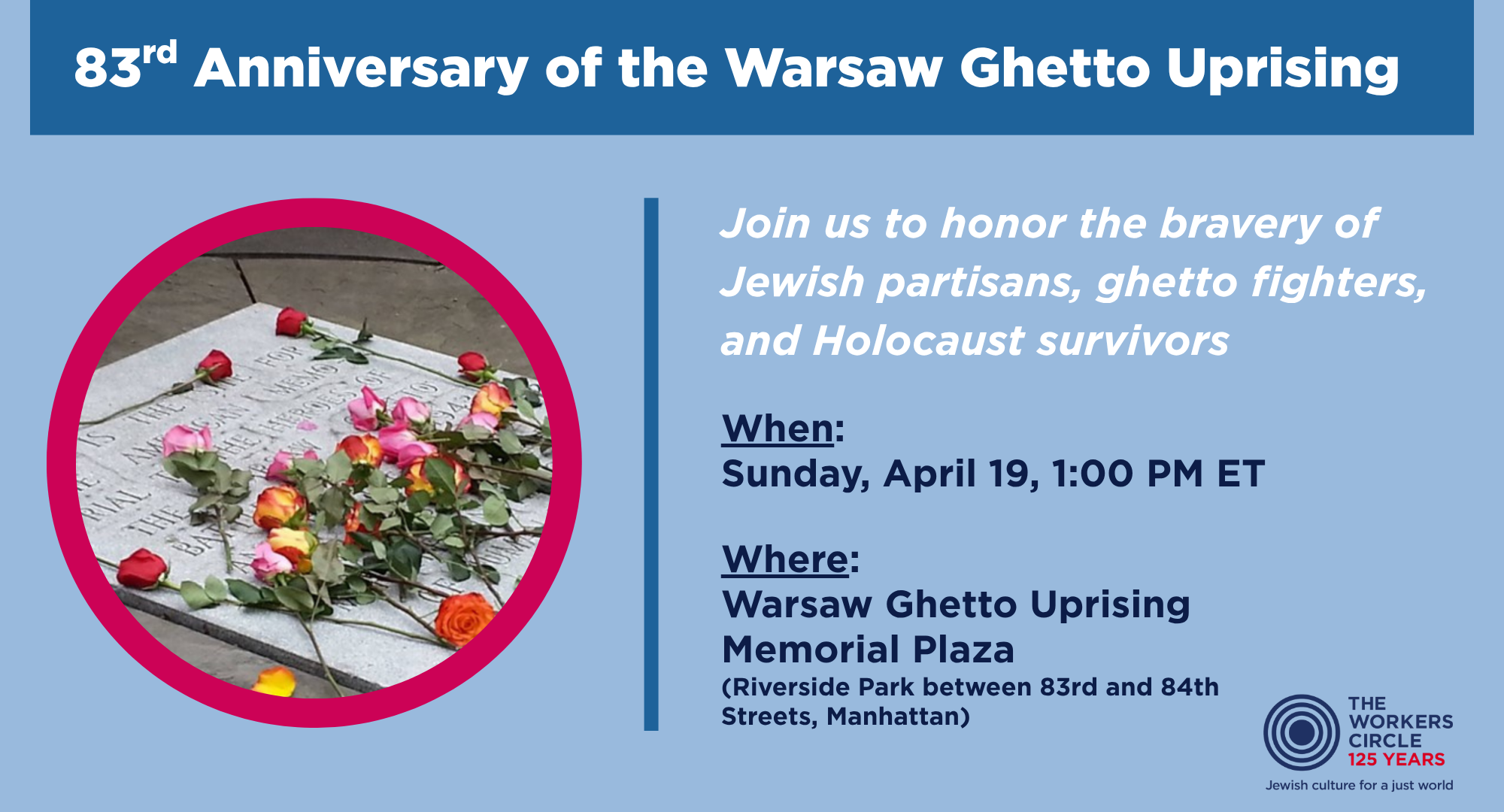 The Congress for Jewish Culture invites you to a memorial marking the 83rd Anniversary of the Warsaw Ghetto Uprising at the memorial stone in Riverside Park (83rd/84th Streets).